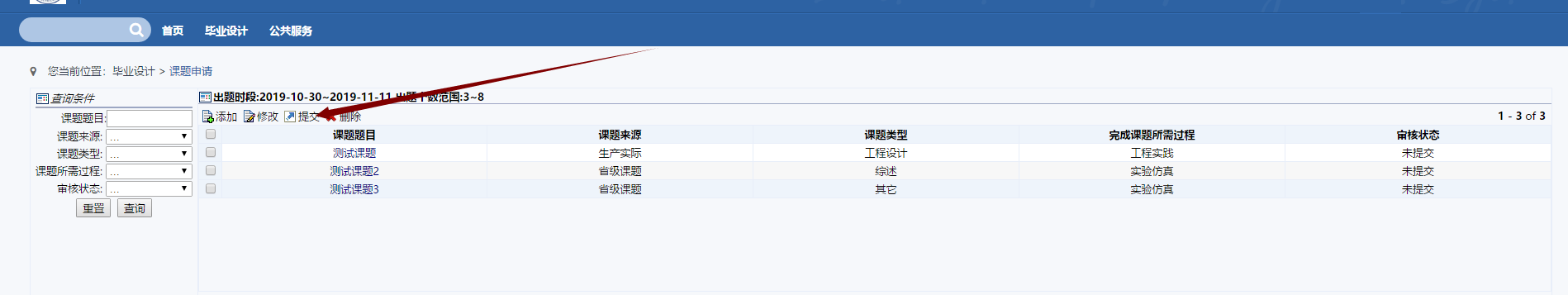 填写完出题信息后,一起提交课题,未达到最低数量不允许提交。