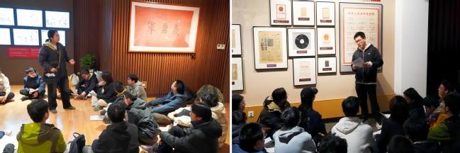 在“沉默的旋律”互动分享环节,同学们结合自身感悟,对馆内文物进行解读交流,寻找那件最能叩击自己心扉的文物。“旗帜虽斑驳,精神永不灭。在国歌展示馆中,这面褪色破损的东北义勇军军旗,是中华民族危亡时刻的见证。它正如国歌所唱‘把我们的血肉,筑成我们新的长城’,象征着在绝境中迸发出的不屈斗志与牺牲精神。这种融入民族血脉的坚韧与顽强,将随国歌世代传唱,永不褪色。”“国歌是凝聚民族魂魄的整体。《义勇军进行曲》诞生于危亡之际,其每一句歌词都饱含爱国热忱与抗争精神,时刻唤起人民对历史的铭记。它让我们在共同的使命下团结奋进,在各岗位上践行担当,为民族复兴贡献力量”。